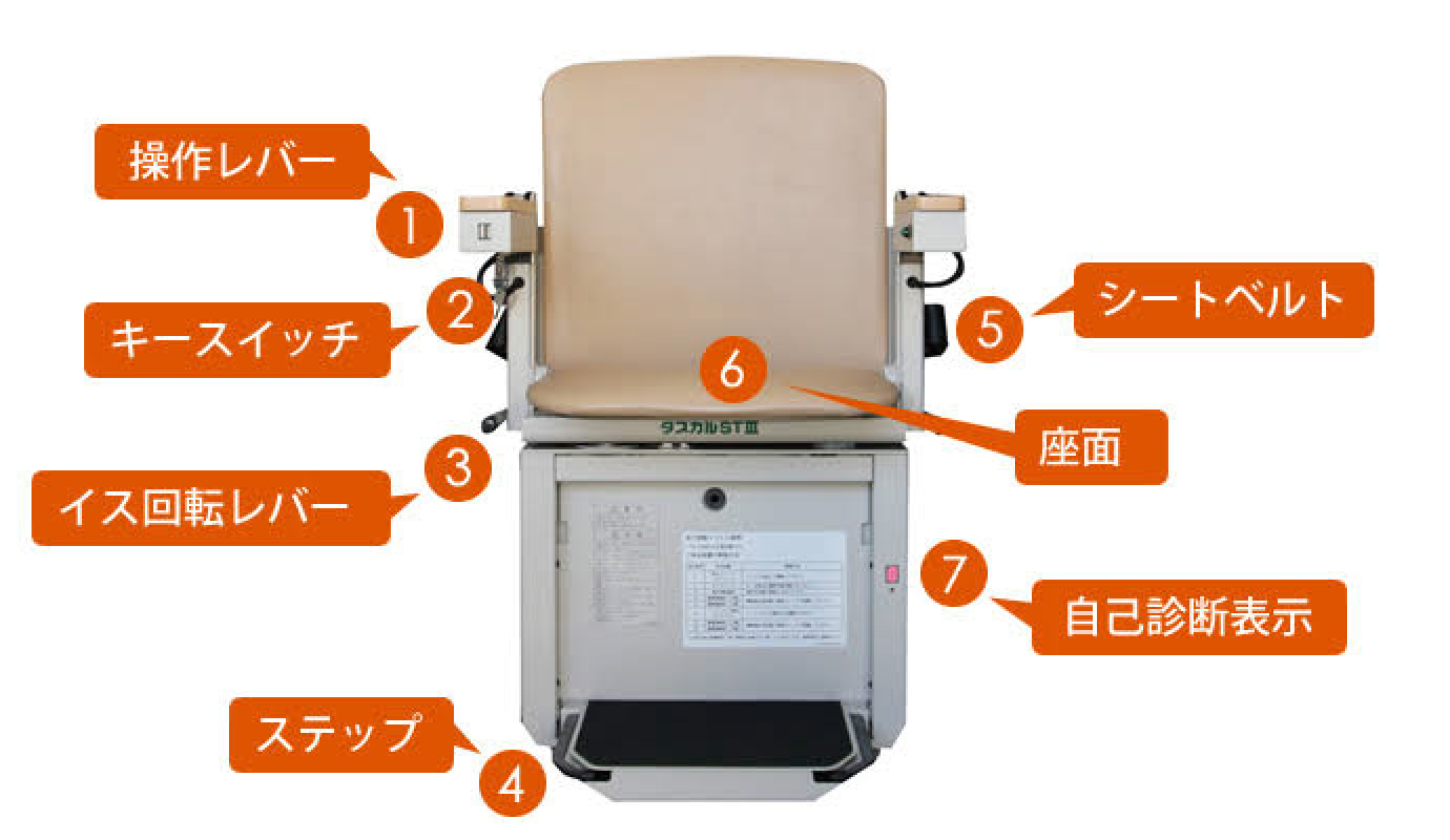 | Standard equipment | ・ Rail (up to 5M) ・ Seat belt ・ Up and down floor call feed switch ・ Chair rotation function ・ Driving key switch ・ Armrest switch ・ Circuit breaker |