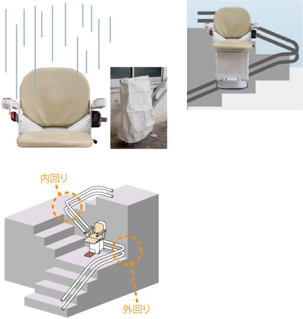 | Standard equipment | ・ Rail (up to 5M) ・ Seat belt ・ Up and down floor call feed switch ・ Chair rotation function ・ Driving key switch ・ Armrest switch ・ Circuit breaker ・ Chair cover |