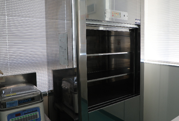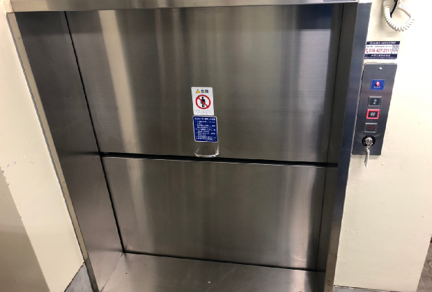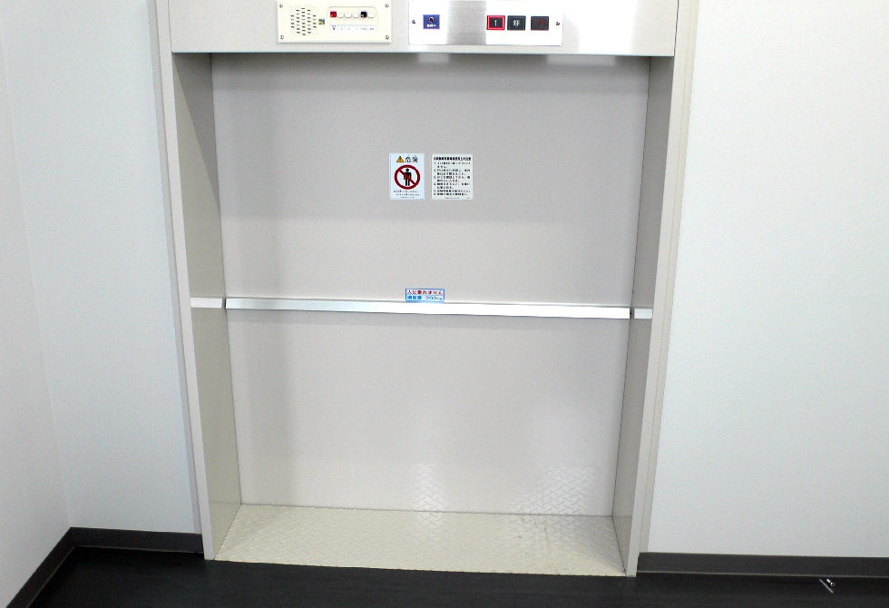 It is a type of elevator that loads and unloads luggage at waist height. There is a shelf so you can efficiently transport tableware and documents.